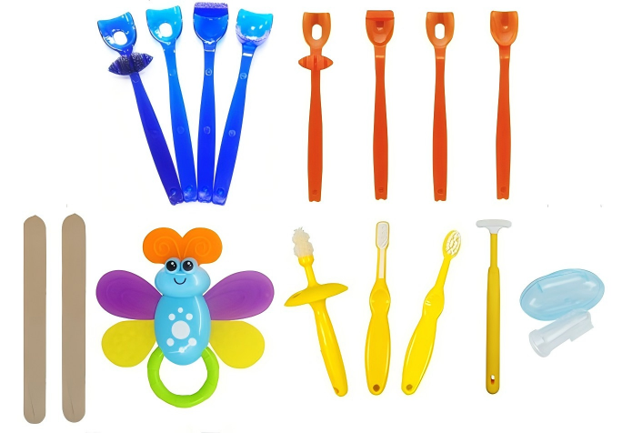 咀嚼器、唇运动训练器、舌尖运动训练器、舌前位运动训练器、舌后位运动训练器、下颌运动训练器(3件)、悬雍垂运动训练器、唇肌刺激器、舌肌刺激器、指套型乳牙刷、压舌板等。
