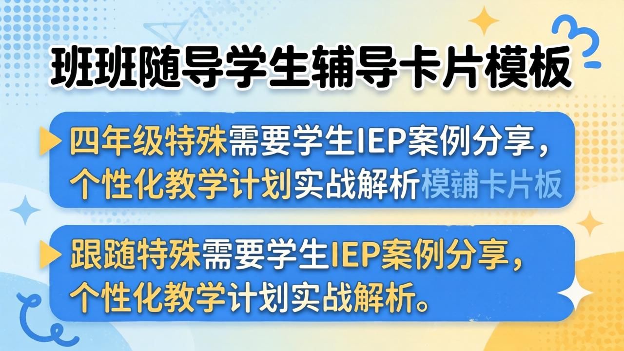 你有没有遇到过这种情况:班里有个随班就读的孩子,每次制定辅导计划时都头疼该怎么写才能既符合个性化需求又方便操作?😅 我刚开始做资源教师时,为了设计一份有效的辅导卡片模板,翻遍了各种资料,直到接触了IEP(个别化教育计划)才找到方向。今天结合四年级小明(化名)的案例,聊聊怎么把辅导卡片从“纸上表格”变成真正能落地的教学工具。