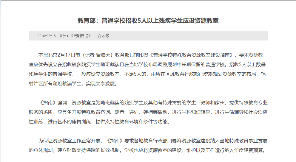 本报北京2月17日电(记者 晋浩天)教育部日前印发《普通学校特殊教育资源教室建设指南》,要求资源教室应优先设立在招收较多残疾学生随班就读且在当地学校布局调整规划