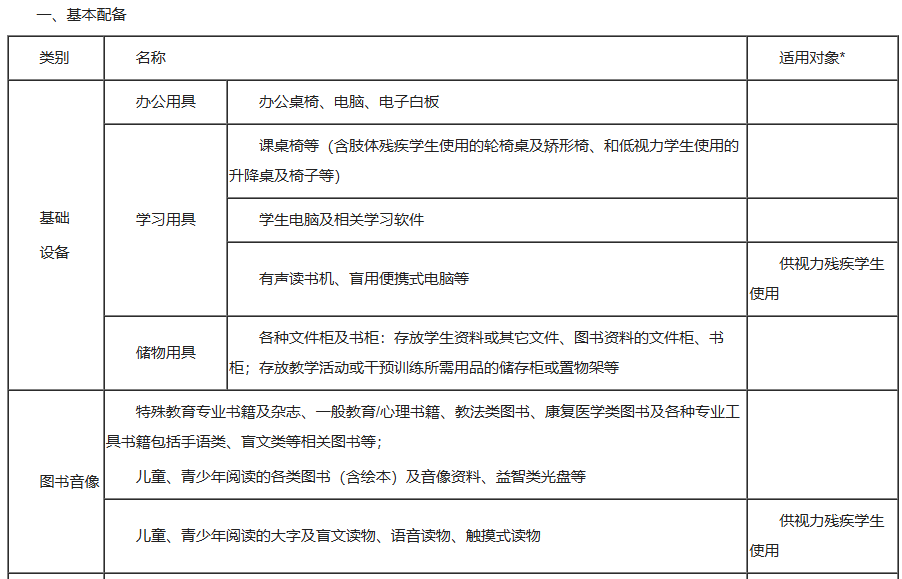 一、基本配备类别名称适用对象*基础设备办公用具办公桌椅、电脑、电子白板学习用具课桌椅等(含肢体残疾学生使用的轮椅桌及矫形椅、和低视力学生使用的升降桌及椅子等)